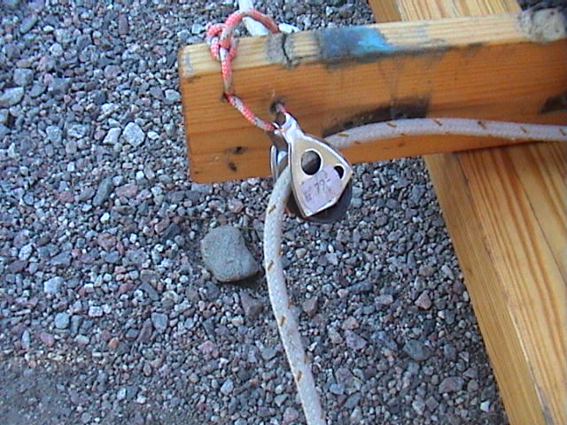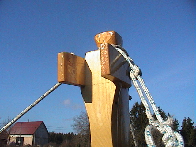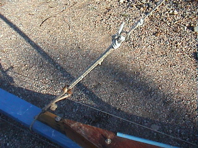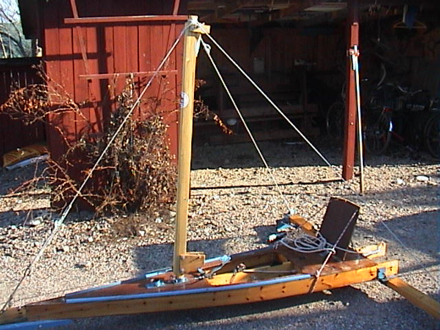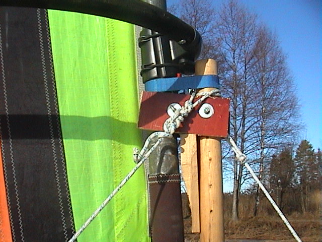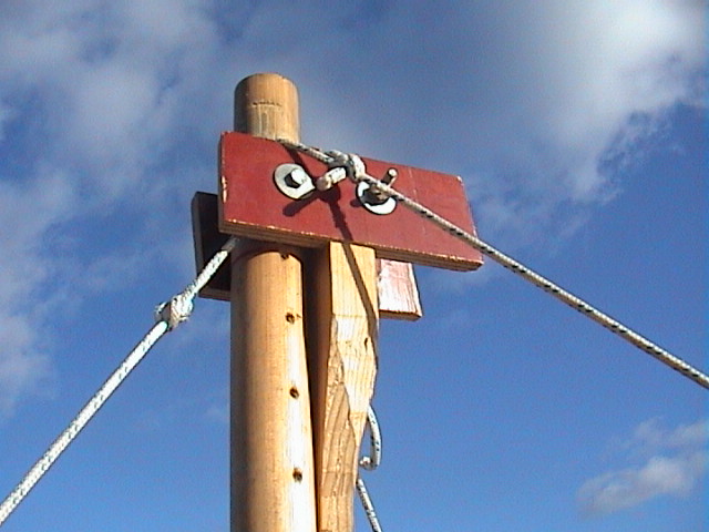 Masten stagas med 5mm Dynema lina; en ögla över toppen och en